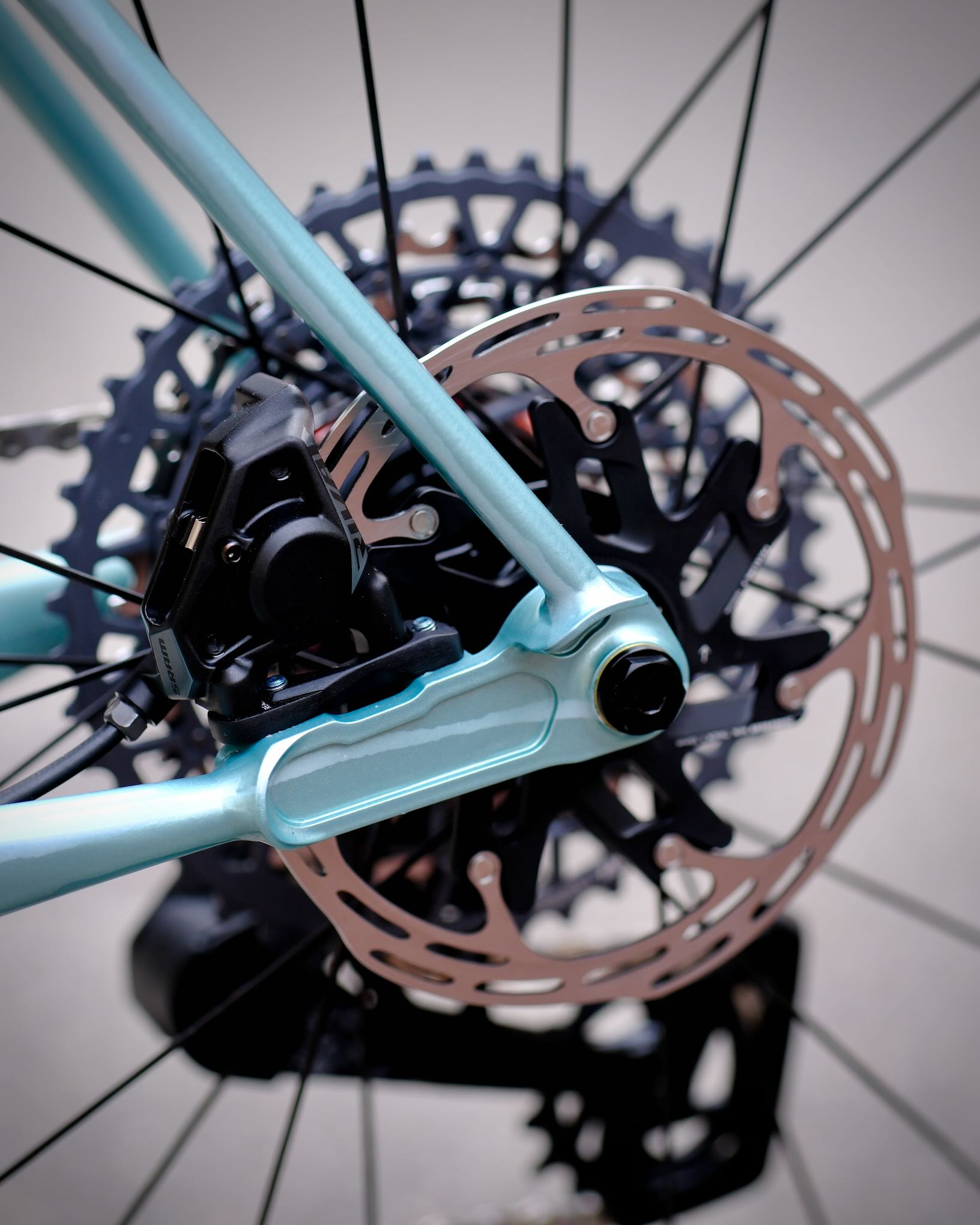 Le triangle arrière autorise le montage de pneus jusqu’à 32mm de large en roues de 700c.